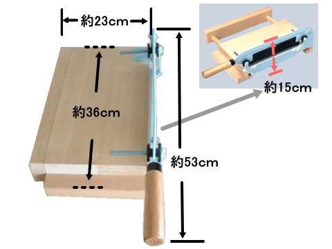 ●ハンドル本体についている表、裏のさくらネジの調節により餅の厚さが選択でき、お好みの厚さに切ることができます。