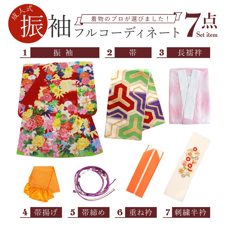 そんな振袖を主役に、成人式や華やかな場面にぴったりなコーディネートを、着物のプロがご用意いたしました!振袖のレトロな雰囲気をより魅力的に惹きたてる帯や小物を組み合わせた、ちょっぴり個性的で周りと差がつくコーディネート7点セットです。