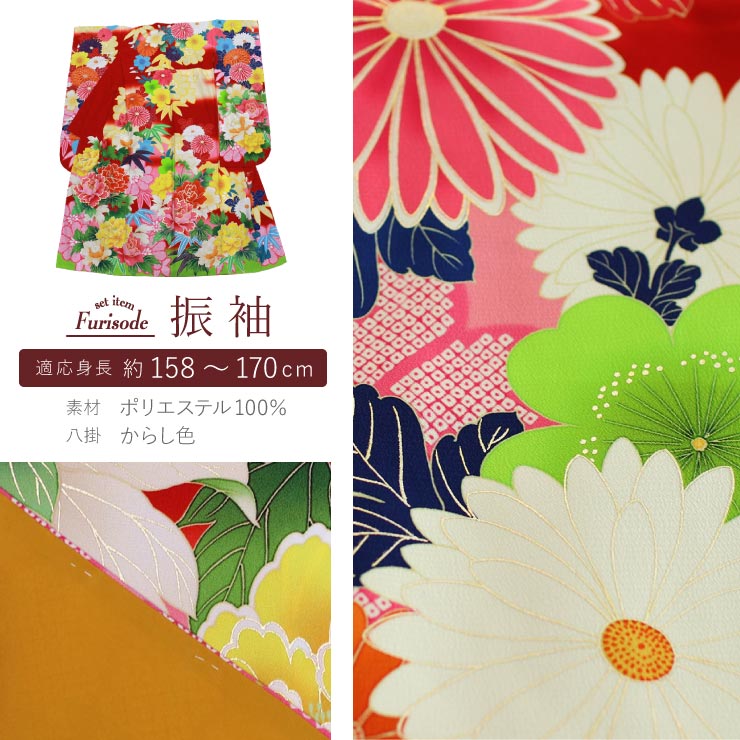 [ 成人式 ] 振袖 コーディネート 7点 牡丹と菊 赤 振袖セット 着物セット 販売 レトロ モダン おしゃれ かわいい 総柄 花柄 菊 花尽くし 絵羽模様 ふりそで 帯 帯揚げ 帯締め 伊達衿 重ね衿 長襦袢 半襟 刺繍半衿 プレタ 袷 きもの 着物 JAPAN STYLE (ym112)